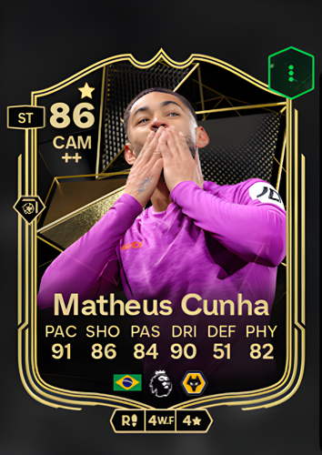 Matheus Santos Carneiro Da Cunha's Team of the Week (TOTW) card is an exciting addition for any squad, featuring him as a Central Attacking Midfielder with an impressive overall rating of 86. This card highlights Cunha's exceptional pace with a rating of 91, making him a dynamic force capable of swift movements and rapid transitions on the field. His shooting prowess is marked by a rating of 86, allowing him to be a formidable threat in front of goal. With a passing rating of 84, Cunha can effectively distribute the ball and create scoring opportunities for his teammates. His dribbling ability, rated at 90, ensures that he can maneuver through tight defenses with ease, while his physicality rating of 82 provides the strength needed to maintain possession and withstand challenges. Although his defense rating is lower at 51, his offensive capabilities make him an indispensable asset for breaking down opposing defenses, creating chances, and sealing victories in crucial matches.