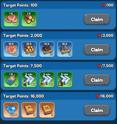 Upon reaching the third milestone, players receive a valuable reward of 600 minutes in speedups, which can greatly aid progress. The ultimate milestone boasts enticing rewards, including 4000 gems and 10 mythic skill manuals.