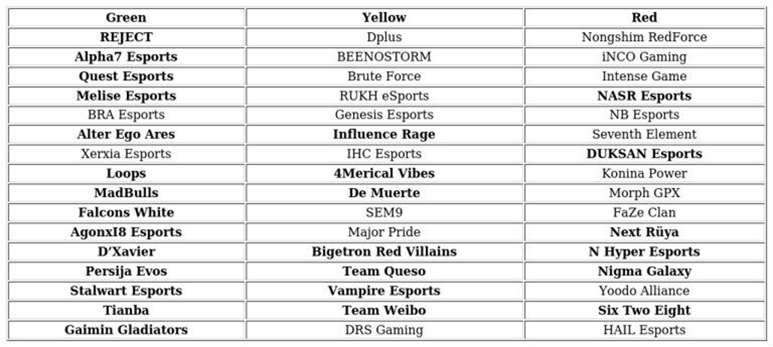 The teams are organized into three distinct groups : green, red, and yellow , each containing 16 teams . After the league matches conclude, the 16 qualifying teams will proceed to the grand finals.