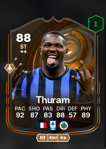 Marcus Thuram's Ultimate Succession card is a formidable addition to any team, featuring an impressive overall rating of 88 as a Striker. This card highlights Thuram's exceptional pace with a rating of 92, allowing him to outmaneuver defenders with ease. His shooting prowess, rated at 87, ensures that he is a constant threat in front of goal, capable of converting opportunities with precision. Complementing his offensive skills, Thuram's dribbling ability is rated at 88, making him adept at navigating through tight spaces and maintaining possession under pressure. While his passing rating of 83 supports his role in creating plays, his physicality, rated at 89, empowers him to hold his ground against tough opposition. Although his defense rating is 57, it is his attacking attributes that truly shine, making him an invaluable asset in breaking down defenses and scoring decisive goals.
