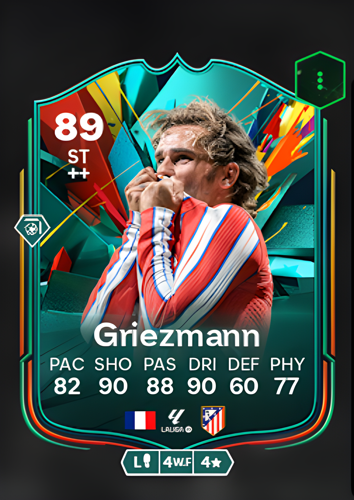 Antoine Griezmann's Total Rush card is a formidable addition to any team, boasting an impressive overall rating of 89. As a Striker, Griezmann excels with a shooting rating of 90 and a dribbling rating of 90, making him a lethal threat in front of goal. His pace rating of 82 allows him to swiftly maneuver past defenders, while his passing rating of 88 ensures he can set up scoring opportunities for his teammates with precision. Although his defense rating is 60, his physicality rating of 77 provides enough resilience to hold his ground against challenging opponents. This card is particularly advantageous for players seeking a sharp attacking presence, as Griezmann's skills can effectively dismantle opposing defenses, providing the crucial edge needed to capitalize on scoring opportunities and secure victory in tight matches.