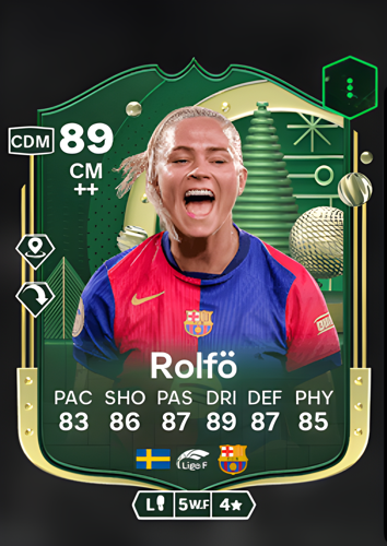 Fridolina Rolfö's Winter Wildcards card is an exceptional addition to any squad, featuring her as a dynamic Center Midfielder with an impressive overall rating of 89. This card showcases her well-rounded capabilities on the field, boasting a pace rating of 83, which ensures she can swiftly navigate the pitch. Her shooting prowess is evident with a rating of 86, making her a formidable threat in front of the goal. The passing rating of 87 highlights her ability to orchestrate plays and distribute the ball effectively, while her dribbling rating of 89 allows her to maneuver past opponents with ease. Defensively, she stands strong with a rating of 87, complemented by a physicality rating of 85, making her a robust presence in midfield battles. As a Center Midfielder, Rolfö's card is invaluable for its versatility and ability to control the tempo of the game, providing a perfect balance of attack and defense to dominate the opposition and secure victory.