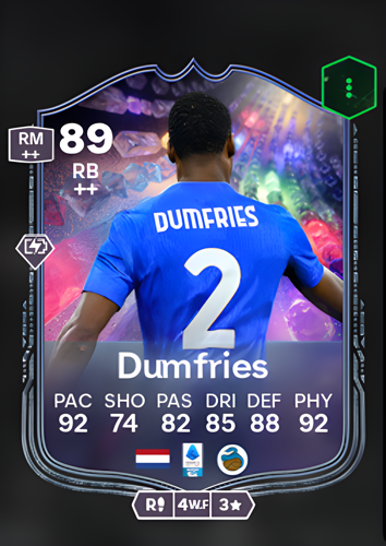 Denzel Dumfries's NumeroFUT card showcases him as a formidable Right Back, boasting an impressive overall rating of 89. This card highlights Dumfries's exceptional pace, rated at 92, making him a swift and agile presence on the field. His defensive prowess is equally notable with a rating of 88, complemented by a robust physicality rating of 92, ensuring he can hold his ground against even the toughest opponents. With a passing rating of 82 and dribbling at 85, Dumfries is not just a defensive asset but also a significant contributor to offensive plays, capable of initiating attacks and maintaining possession under pressure. His shooting rating of 74, while not his standout feature, adds an extra layer to his versatility on the pitch. In his role as a Right Back, Dumfries's card offers numerous advantages, including the ability to rapidly disrupt opposing offenses, provide crucial defensive cover, and support swift counter-attacks, making him an invaluable player in any lineup.