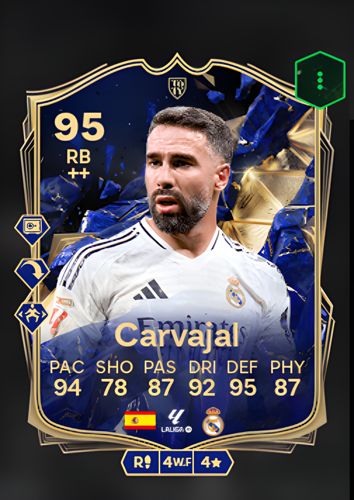 Daniel Carvajal Ramos's Team of the Year (TOTY) card is a formidable addition to any squad, boasting an impressive overall rating of 95. As a Right Back, Carvajal's card excels with a pace rating of 94, ensuring he can keep up with the fastest wingers in the game. His defensive prowess is highlighted by a stellar defense rating of 95, making him a rock-solid presence at the back. Additionally, his dribbling and passing ratings of 92 and 87, respectively, allow him to transition seamlessly from defense to attack, providing crucial support in both areas of the pitch. With a physicality rating of 87, Carvajal is not only quick and agile but also strong enough to hold his ground against physical opponents. This card is ideal for players looking to reinforce their defense with a player who can both thwart attacks and initiate offensive plays, making him a versatile asset capable of turning the tide in any match.