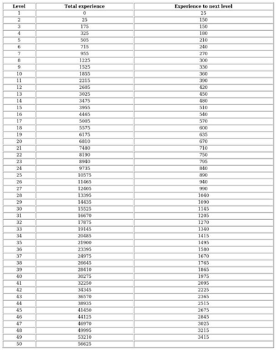 As you progress, the experience required to level up increases in a semi-exponential manner.