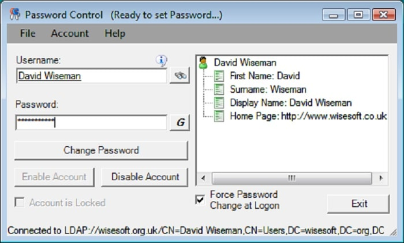 Wisedataman Password Control is a lightweight utility designed to facilitate account management within Active Directory.