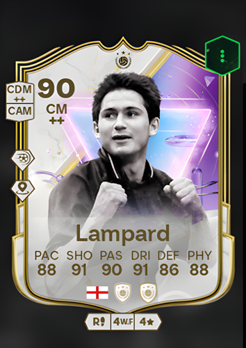Frank Lampard's Icon card is a formidable addition to any team, epitomizing the qualities of a world-class center midfielder with an impressive overall rating of 90. This card boasts a remarkable pace rating of 88, allowing Lampard to cover ground swiftly and transition effectively between defense and attack. His shooting prowess is reflected in a high rating of 91, making him a constant threat from distance and capable of scoring crucial goals. With a passing rating of 90, Lampard can orchestrate play with pinpoint accuracy, setting up teammates with ease. His dribbling ability, rated at 91, ensures he can maneuver through tight spaces and maintain possession under pressure. Defensively, he remains solid with a rating of 86, providing stability and support in the midfield. Coupled with a physicality rating of 88, Lampard’s Icon card offers a balanced and dynamic presence on the field, making it an invaluable asset for controlling the tempo of the game and breaking down opposition defenses.