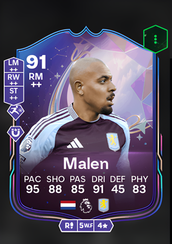 Donyell Malen's Fantasy FC card is a standout choice for any Ultimate Team enthusiast, boasting an impressive overall rating of 91 as a Right Midfielder. This card is a testament to Malen's explosive abilities on the field, with a remarkable pace rating of 95 that makes him one of the quickest players available. His shooting prowess is reflected in a solid 88 rating, ensuring that he can capitalize on scoring opportunities with precision. Complemented by a passing rating of 85, Malen can effectively distribute the ball and create scoring chances for his teammates. His dribbling skills, rated at 91, allow him to maneuver through defenses with ease, making him a constant threat on the wing. Although his defense rating is a modest 45, his physicality rating of 83 provides the necessary strength to hold off challenges. As a sharp attacking player, Malen's card is ideal for breaking down defenses and seizing crucial moments to secure victory in any match.