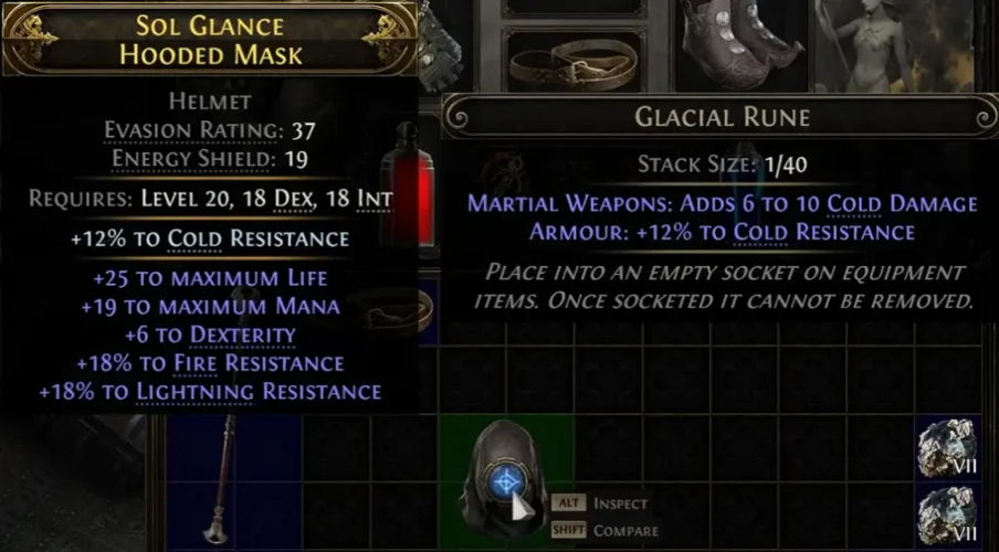 For instance, a body armor with two socketed iron runes can offer an impressive 40% increase in both evasion and energy shield.