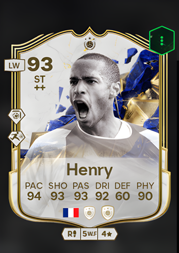 Thierry Henry's Icon card is a formidable asset in the realm of football gaming, epitomizing excellence with an impressive overall rating of 93. As a Striker, Henry's card boasts a blistering pace of 94, ensuring he can outmaneuver defenders with ease. His shooting prowess is equally remarkable, rated at 93, making him a lethal finisher capable of converting even the most challenging opportunities into goals. Complementing his offensive capabilities is a passing rating of 93, allowing for precise and strategic playmaking. With a dribbling rating of 92, Henry can navigate through the tightest defenses, adding fluidity and flair to his attacking maneuvers. Despite a modest defense rating of 60, his physicality stands strong at 90, enabling him to hold his ground against robust opponents. This card is a testament to Henry's unparalleled ability to spearhead an attack, offering players the chance to swiftly dismantle opposing defenses and seize victory with clinical precision.