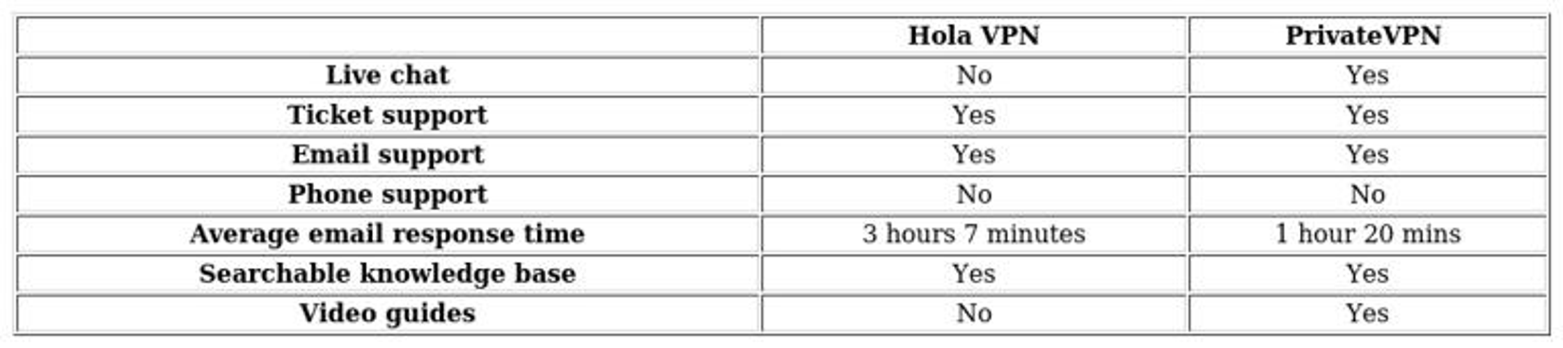 PrivateVPN and Hola VPN differ notably in customer assistance quality and accessibility.\n\nPrivateVPN stands out with its lightning-fast email replies, averaging under two minutes per response—a speed comparable to real-time chat systems.\nHola VPN’s email support, while generally reliable at around three hours, suffers from inconsistency, with one test query ignored for eight hours.\n\nLive chat availability splits the two further—PrivateVPN offers near-24/7 instant messaging, while Hola VPN lacks this feature entirely.\nNeither provider includes phone-based troubleshooting, aligning with industry norms.\n\nSelf-help resources reveal another contrast: Hola VPN’s detailed knowledge base features searchable articles and visual setup tutorials, whereas PrivateVPN’s documentation remains less comprehensive.\nBoth platforms omit video guides despite maintaining dormant YouTube channels.\n\nSupport effectiveness tilts decisively toward PrivateVPN, combining rapid resolutions with precise answers.\nHola VPN, despite its robust informational library, struggles to match this reliability in direct user assistance.