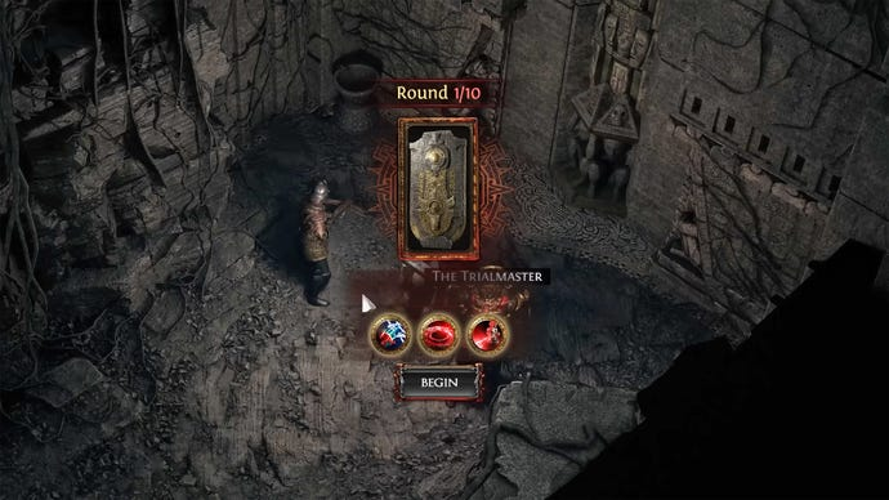 Upon entering the Temple of Chaos, you will encounter an offering altar, characterized by a stone pillar with a glowing red core. You must place the inscribed ultimatum on this altar to unlock the door leading to the Trial of Chaos, which will materialize adjacent to the altar. Shortly after stepping inside, you'll be greeted by the Trialmaster, who will ask you to select one of three challenge modifiers. This choice will determine the challenge's difficulty level, and then you can proceed to the first round of trials.