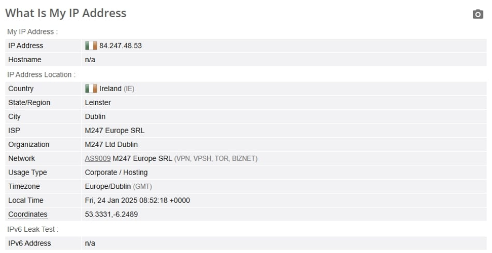 Privacy is a top priority, with the service employing 256-bit encryption and built-in protection against DNS, WebRTC, and IPv6 leaks. We verified the effectiveness of these security measures by connecting to an Irish server and conducting several leak tests, confirming that no data was compromised.