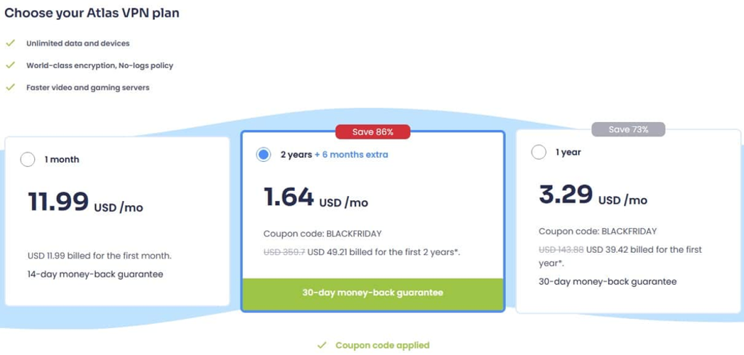 Atlas VPN's Black Friday deal has reduced its price to an unprecedented level. Moreover, for three whole years, you won't need to pay any additional fees. This is not something you can be assured of with a monthly plan. Atlas VPN is also one of the top - rated providers. It has a very high ranking for speed and is compatible with almost all major streaming platforms. In brief, this deal is not to be missed.