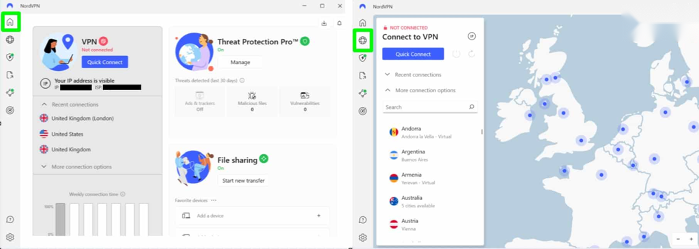 PureVPN’s interface stands out with a modern layout featuring left-aligned navigation tabs, a departure from traditional hidden menus.
