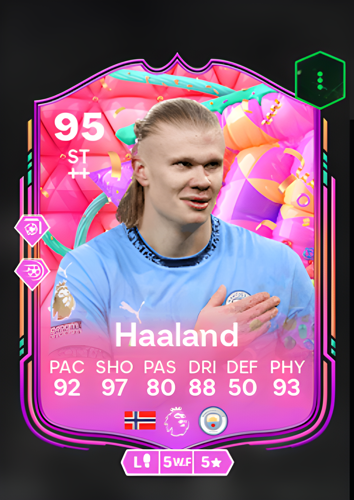 Erling Haaland's FUT Birthday card is a remarkable addition for any FIFA Ultimate Team enthusiast, featuring an overall rating of 95 as a Striker. This card boasts an impressive pace rating of 92, allowing Haaland to swiftly maneuver past defenders. His exceptional shooting rating of 97 makes him a lethal finisher, capable of converting even the most challenging opportunities into goals. With a passing rating of 80, he can effectively contribute to build-up play, while his dribbling rating of 88 ensures he can navigate through tight spaces with ease. Although his defense rating is at 50, his physicality rating of 93 highlights his ability to dominate in physical duels. As a Striker, Haaland's card is an invaluable asset, offering sharp attacking prowess that can dismantle opposing defenses, seize scoring opportunities, and ultimately secure victories in crucial matches.