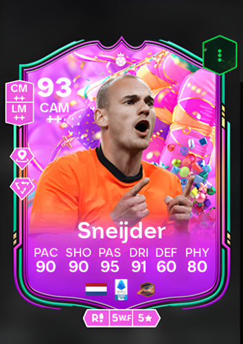 Wesley Sneijder's FUT Birthday Hero card is an exceptional addition to any FIFA Ultimate Team lineup, boasting an impressive overall rating of 93. As a Central Attacking Midfielder, Sneijder's card is characterized by remarkable attributes that make him a formidable force on the pitch. With a pace rating of 90, he can swiftly navigate through defenses, while his shooting rating of 90 ensures precision and power in front of goal. His passing prowess, rated at an outstanding 95, allows for creating dynamic plays and setting up teammates with ease. Coupled with a dribbling rating of 91, Sneijder can maneuver through tight spaces with agility and finesse. Though his defense rating is modest at 60, his physicality rating of 80 provides the necessary resilience to hold his ground against opponents. This card is a strategic asset for players seeking to dominate the midfield, orchestrate attacks, and capitalize on scoring opportunities, ultimately turning the tide in crucial moments of the game.