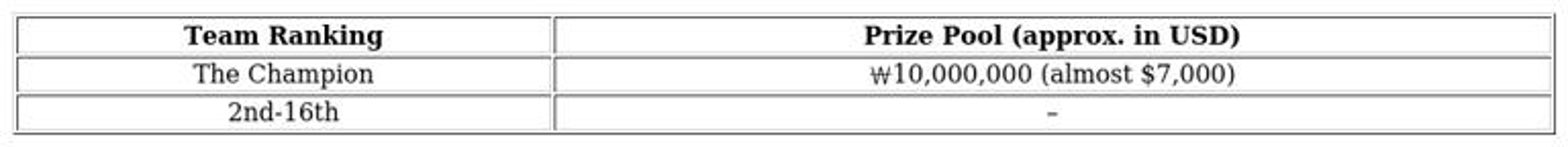 A total prize pool of ₩10,000,000 (approximately $7,000) will be awarded to the teams based on their performance at the conclusion of the tournament. The unique aspect of this competition is that the winning team will receive the entire prize, leaving nothing for the other participants. This setup emphasizes that the event serves primarily as a qualifier to select teams for future competitions.