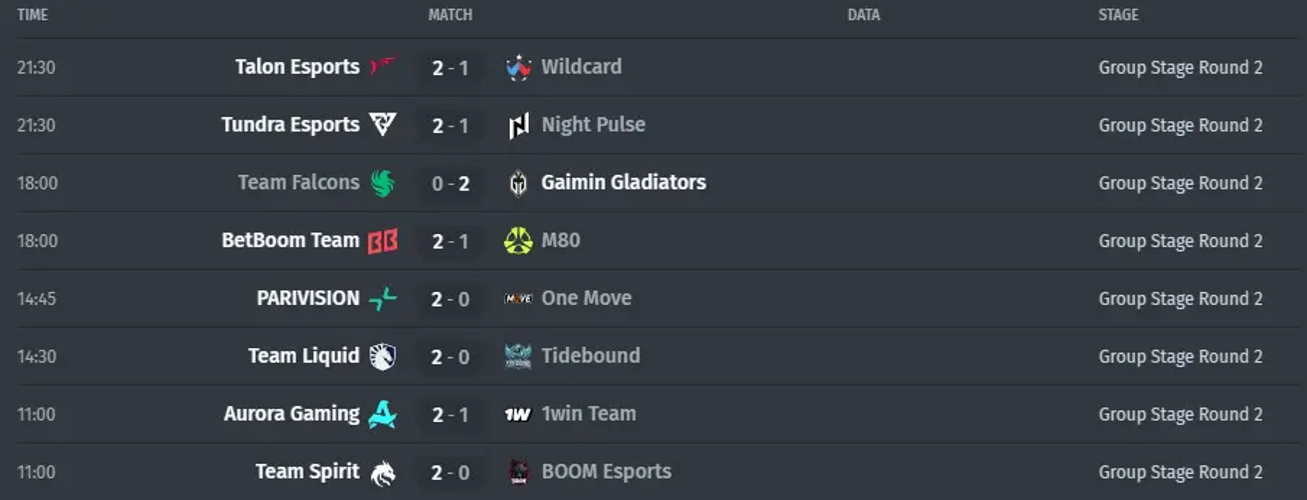 In the middle tier, several teams share a balanced 1-1 record: Boom Esports, Team Falcons, Aurora Gaming, Parivision, Talon Esports, BetBoom Team, and Night Pulse. They are preparing to battle for improved standings in the next rounds.