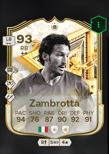Gianluca Zambrotta's Icon card stands out as a formidable addition to any squad, especially for those seeking a top-tier Right Back. With an impressive overall rating of 93, this card boasts exceptional attributes that highlight Zambrotta's prowess on the field. His remarkable pace rating of 94 ensures he can swiftly cover ground, making him an invaluable asset in both defensive maneuvers and offensive support. Complemented by a passing rating of 87 and dribbling rating of 90, Zambrotta is adept at maintaining possession and creating opportunities for his teammates. His defensive capabilities are underscored by a defense rating of 92, allowing him to effectively thwart opposing attacks. Furthermore, a physicality rating of 91 ensures he can hold his ground against challenging opponents, making him a reliable force in high-pressure situations. Whether it's breaking down the opposing team's defense with sharp, strategic plays or securing your team's backline, Zambrotta's Icon card is designed to elevate your game and help you seize victory.