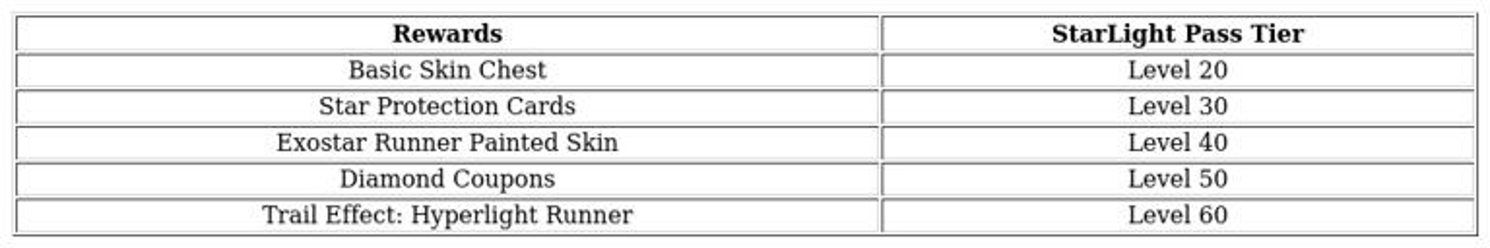 by completing specific Starlight tasks and reaching level 40, players can earn the exostar runner painted skin variant. furthermore, a second painted variant named hyperlight runner can be obtained for a reduced price of just 100 diamonds, a fantastic deal compared to its regular cost of 749 diamonds!