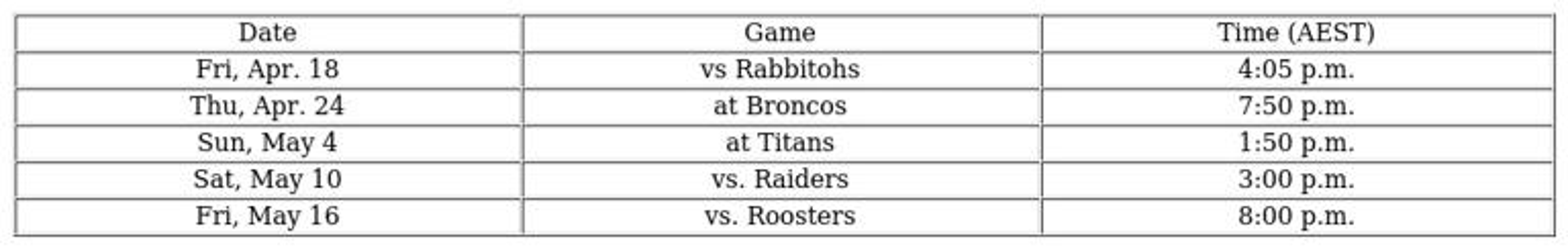 Round 12: June 7 vs. Sydney Roosters @ Accor Stadium (7:50pm AEST)