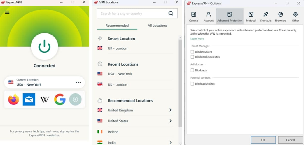 : A well-known service that works well in high-censorship countries. It's a great choice for users who prefer simplicity without sacrificing advanced settings. ExpressVPN has a proven zero-logs policy.