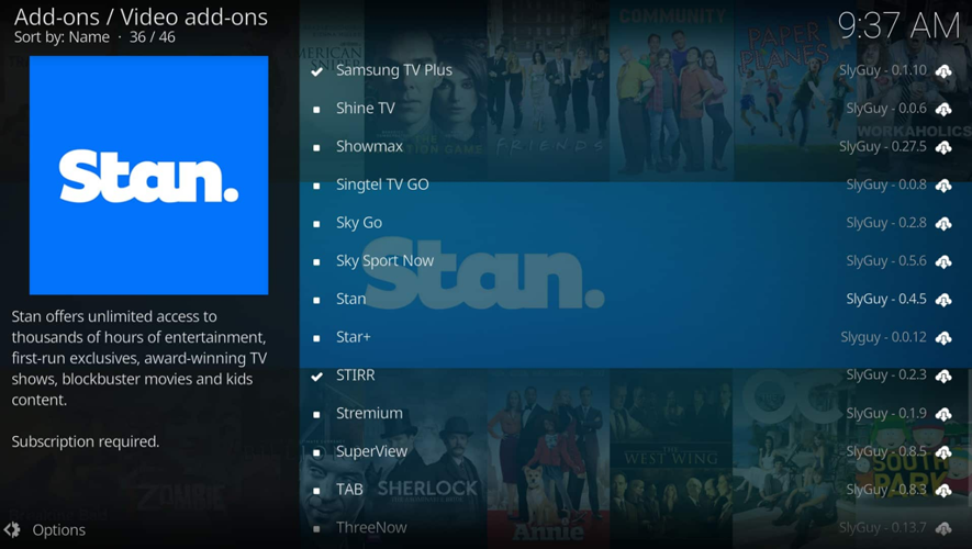 One of Australia's leading streaming services, Stan, can now be enjoyed directly through Kodi. However, to start watching, you'll need an active account. Subscription plans are available starting at $10 AUD per month.