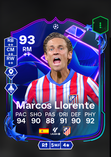 Marcos Llorente Moreno's UCL Dreamchasers card is a highly coveted addition for any FIFA enthusiast, boasting an impressive overall rating of 93. As a Right Midfielder, Llorente's card is a powerhouse of versatility and skill, highlighted by a blistering pace rating of 94 that enables him to sprint down the flanks with ease. His shooting prowess, rated at 90, ensures he can capitalize on scoring opportunities, while a passing rating of 88 allows him to orchestrate play effectively. Complemented by a dribbling rating of 91, Llorente can maneuver through tight defenses with agility and finesse. Additionally, his defense and physicality ratings, both in the 90s, make him a formidable presence on the field, capable of both breaking up opposition attacks and maintaining possession. This card is a game-changer, offering a sharp attacking edge that can dismantle opposing defenses and secure crucial victories.