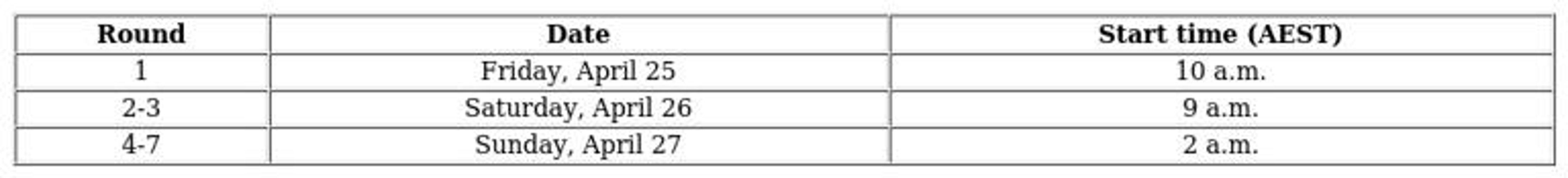 Friday, April 25 at 10:00 AM AEST for Round 1
