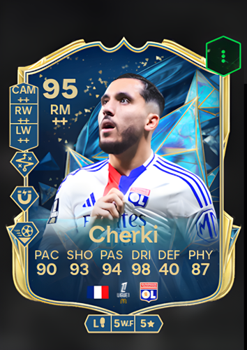 Rayan Cherki's player card boasts an impressive overall rating of 95, positioning him as a formidable Right Midfielder in the game. Cherki's card is characterized by exceptional attributes that make him a standout player. His pace rating of 90 ensures he can swiftly maneuver down the wing, while his shooting rating of 93 allows him to capitalize on scoring opportunities with precision. His passing rating of 94 facilitates seamless playmaking, and his remarkable dribbling rating of 98 makes him a master at navigating through tight defensive lines. Although his defense rating is a modest 40, his physicality rating of 87 provides him with the strength to hold his ground against opponents. As a winger, Cherki's card is a strategic asset, capable of dismantling opposing defenses with sharp attacking prowess and creating decisive chances to score and secure victory in crucial moments of the game.