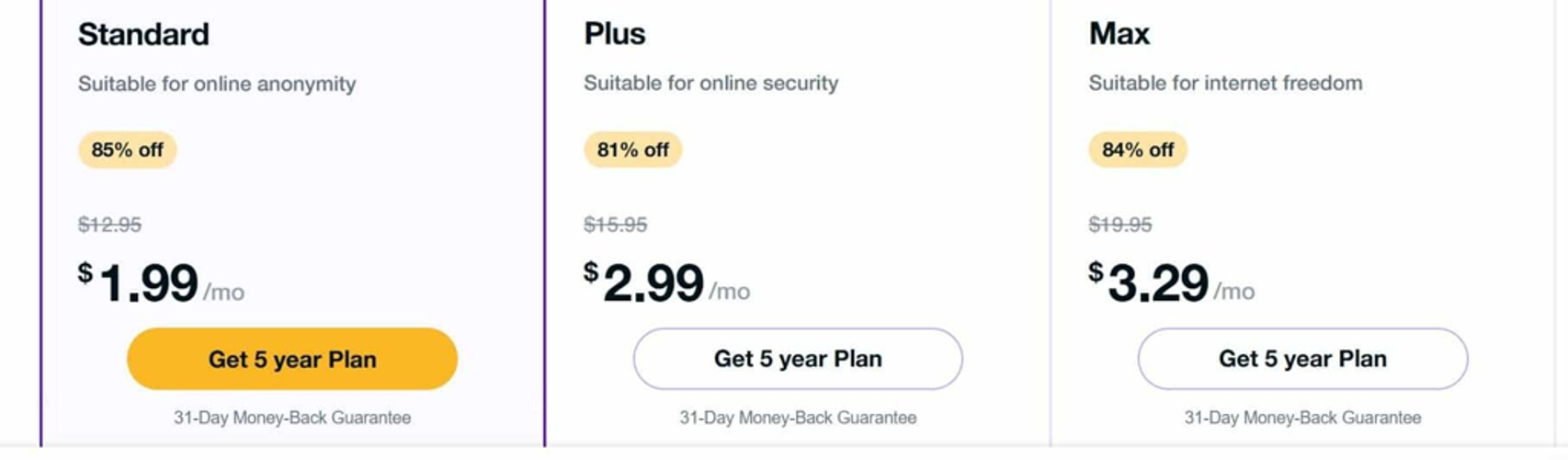 For users seeking enhanced features, PureVPN provides alternative options with similarly impressive discounts. Their Plus plan is available with an 81% reduction when choosing the 5-year commitment, bringing the monthly cost down to just $2.99.