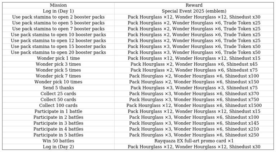 With so many exciting opportunities to earn rewards and collect unique cards, the Rayquaza EX drop event and special missions in 2025 are not to be missed!