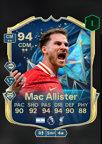 Alexis Mac Allister's Team of the Season card is a remarkable addition to any squad, boasting an impressive overall rating of 94 as a Central Defensive Midfielder. This card showcases Mac Allister's exceptional attributes, including a pace rating of 90, shooting at 92, and both passing and dribbling at an outstanding 94. His defensive capabilities are marked by a rating of 90, complemented by a physicality rating of 88, making him a versatile and formidable presence on the field. As a central defensive midfielder, Mac Allister's card offers significant advantages, providing a robust backbone to the team's defense while also facilitating quick transitions into attack. His sharp passing and dribbling skills enable him to control the midfield, disrupt opposing plays, and create goal-scoring opportunities, ensuring a seamless and dynamic gameplay experience.