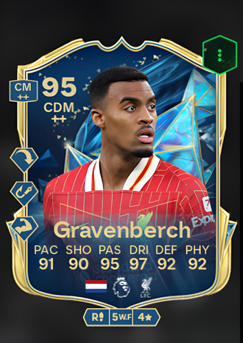 Ryan Gravenberch's Team of the Season card boasts an impressive overall rating of 95, capturing the essence of a formidable Central Defensive Midfielder. With an exceptional pace rating of 91, Gravenberch is not only quick on his feet but also adept at transitioning between defense and attack. His shooting prowess is highlighted by a rating of 90, making him a threat even from a distance. The card's passing rating of 95 ensures that he can orchestrate plays with precision, while his dribbling rating of 97 allows him to maneuver skillfully through tight spaces. Defensively, Gravenberch is a powerhouse with a defense rating of 92, coupled with a physicality rating of 92, making him a formidable opponent in duels. This card is ideal for those looking to dominate the midfield, breaking down opposition attacks and launching counter-attacks with ease, truly making him an invaluable asset in any squad.