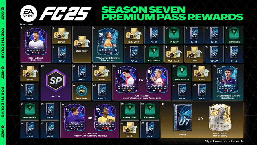 : Dès votre premier niveau, obtenez Kenny Lala Flashback (94). Au fur et à mesure de votre progression, des stars comme Dries Mertens, Lisandro Martinez, Chiesa, Batshuayi et, en récompense ultime, Franck Ribéry icône (96) vous attendent, sans oublier un pack échangeable 90+ x4.