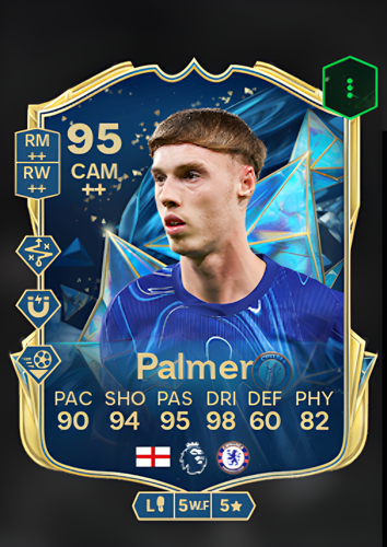 Cole Palmer's Team of the Season card is a remarkable addition to any squad, showcasing his prowess as a Central Attacking Midfielder with an impressive overall rating of 95. This card highlights his exceptional abilities with a pace rating of 90, allowing him to navigate the field swiftly and efficiently. His shooting prowess is reflected in a rating of 94, making him a formidable threat in front of goal. The passing rating of 95 ensures that Palmer can orchestrate plays with precision and creativity, while his dribbling rating of 98 allows him to maneuver past defenders with ease. Although his defense rating stands at 60, his physicality rating of 82 provides adequate strength to hold off challenges. As a CAM, Palmer's card is a game-changer, offering the ability to dismantle defenses with sharp attacks, creating scoring opportunities, and potentially turning the tide of any match in your favor.