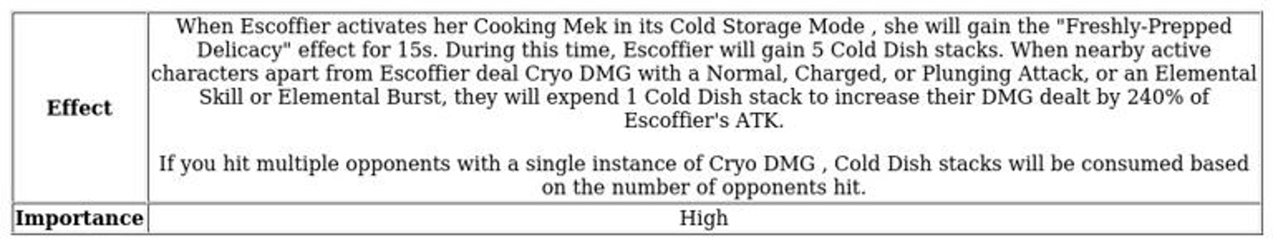 The unique aspect of C2 is the freshly-prepped delicacy effect, which generates cold dish stacks. These stacks empower active Cryo characters, enhancing their damage output depending on Escoffier's attack power.