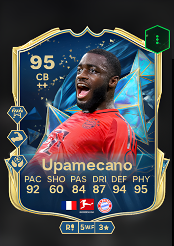 Dayot Upamecano's Team of the Season card is an exceptional addition for any FIFA enthusiast looking to bolster their defense with a powerhouse center back. Boasting an impressive overall rating of 95, this card highlights Upamecano's remarkable attributes that make him a formidable presence on the field. With a pace rating of 92, he can swiftly close down attackers, while his defense rating of 94 ensures he is a wall against opposing offenses. His physicality rating of 95 further emphasizes his ability to dominate in duels, making him an intimidating force in any defensive lineup. Additionally, with a passing rating of 84 and dribbling at 87, Upamecano is not just a defensive stalwart but also a player capable of initiating plays from the back, ensuring smooth transitions from defense to attack. This card is an invaluable asset for those seeking to solidify their backline and maintain a robust defense throughout the game.