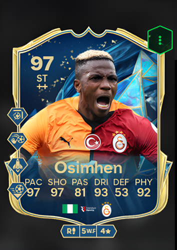 Victor Osimhen's Team of the Season card emerges as a formidable force in the virtual football realm, boasting an impressive overall rating of 97 as a Striker. This extraordinary player card is characterized by its remarkable attributes, including a blistering pace of 97, lethal shooting ability rated at 97, and exceptional dribbling skills with a rating of 93. While his passing stands at a solid 81, Osimhen's physicality is a noteworthy 92, making him a powerhouse on the field. As a striker, this card offers distinct advantages, enabling players to exploit his sharp attacking prowess to dismantle opposing defenses with ease. His high pace and shooting ratings ensure that he can seize scoring opportunities swiftly, potentially turning the tide of the game and securing victory with his decisive play.