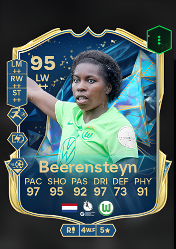 Lineth Beerensteyn's Team of the Season card is a remarkable addition to any squad, showcasing her prowess as a Left Wing with an impressive overall rating of 95. This card highlights her exceptional attributes, including a blistering pace rating of 97, which allows her to outmaneuver defenders with ease and create scoring opportunities. Her shooting prowess is equally noteworthy, standing at 95, ensuring she can capitalize on chances with precision. Complementing her offensive skills, Beerensteyn's passing ability is rated at 92, facilitating seamless ball distribution and playmaking. Her dribbling skill, rated at 97, makes her a formidable force in tight spaces, enabling her to navigate through defenses effortlessly. Additionally, her physicality rating of 91 ensures she can withstand challenges and maintain possession under pressure. As a sharp attacking player, Lineth Beerensteyn's card is invaluable for tearing apart opposing defenses and seizing the opportunity to score decisive goals, making her an indispensable asset in any competitive match.