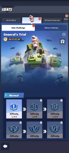 To start your journey, tap the “challenge” button or the general's icon on the map. This action will present a map with numbered tanks signifying various difficulty levels. Players can either tackle these tanks independently or coordinate a rally. It’s advisable to focus on solo challenges in the beginning, reserving rallies for the more demanding levels ahead.