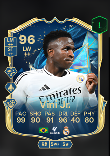 Vinícius José de Oliveira Júnior's Team of the Season card is a formidable addition to any squad, especially for those looking to dominate the left wing position. With an impressive overall rating of 96, this card showcases Vinícius Júnior's exceptional skills and attributes that make him a standout player on the field. His pace rating of 99 ensures he can outrun any defender, while his dribbling rating of 96 allows him to maneuver through tight spaces with ease. Coupled with his shooting rating of 90 and passing rating of 91, Vinícius Júnior is not only a threat in front of goal but also a key playmaker who can create scoring opportunities for his teammates. Although his defense rating is 40, his physicality rating of 80 provides enough strength to hold off challenges and maintain possession. As a sharp attacking winger, Vinícius Júnior can swiftly dismantle opposing defenses, seize scoring chances, and potentially secure victory in crucial matches.