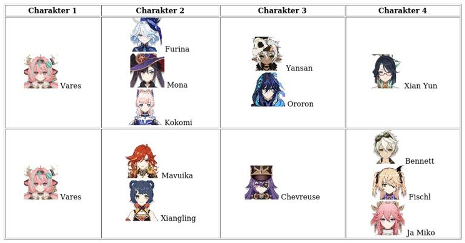 In Bezug auf die optimalen Teams ist Varesa unverzichtbar. Jedoch kann der Testspieler Adepta Xian Yun in das Team integriert werden. Es wird empfohlen, dem ersten Team Hydro und Elektro Sub-Damage Dealers hinzuzufügen. Im zweiten Team sollte der Fokus auf Pyro und nicht auf Elektro Sub-Damage Dealers liegen, um den Status effektiv zu nutzen und Unentschieden zu verursachen.