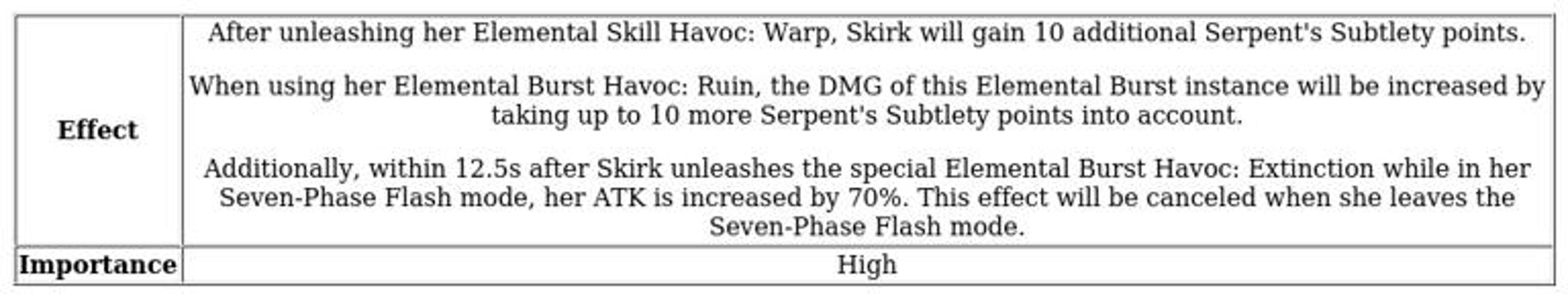 When Skirk reaches Constellation 2, her presence on the battlefield is significantly enhanced, allowing her to remain active for extended periods and inflict increased damage. Additionally, activating her unique elemental burst during her seven-phase flash mode grants her an immediate 70% boost in attack power. This enhancement greatly amplifies her damage output, making her a formidable force in combat scenarios.