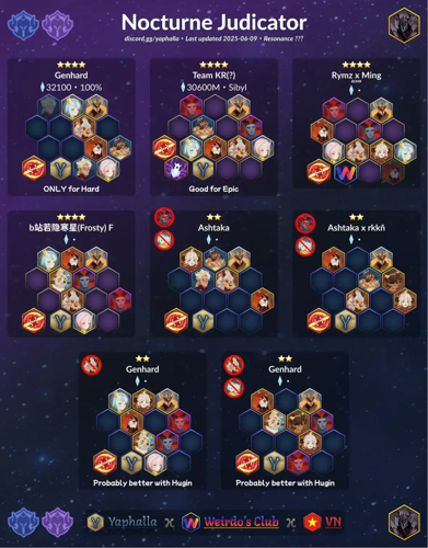 For practical guidance, here are some example team compositions. Special thanks go to Yaphalla, whose insights and resources can be found on their website and Discord community, providing valuable strategies for tackling Nocturne Judicator effectively.