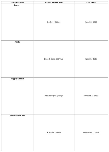 There are four exclusive virtual bonus items tied to this collaboration. While some of these items have appeared in the past, most have been unavailable in the Fortnite item shop for over two years. The majority of these bonuses are decorative wraps, and currently, there are no Fortnite x Youtooz-themed skins available.