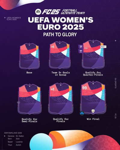 Im Rahmen des EA Sports FC 25 Ultimate Teams wird das Event „UEFA Women's Euro 2025 Path to Glory“ speziell für die Frauen-Europameisterschaft ins Leben gerufen. Ziel ist es, die besten Spielerinnen der teilnehmenden Teams zu präsentieren, ihre Bewertungen zu verbessern und ihre Fortschritte im Turnier zu dokumentieren.