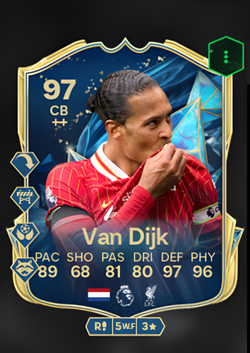 Virgil van Dijk’s Team of the Season card stands out as a powerhouse at center back, boasting an impressive overall rating of 97. With a remarkable 97 in defense and 96 in physicality, van Dijk is a formidable presence in the back line, capable of shutting down even the most talented attackers. His pace rating of 89 ensures he can keep up with speedy forwards, while 81 in passing and 80 in dribbling add a layer of composure and ball control that is rare for a defender. This combination of elite defensive attributes and surprising agility makes van Dijk’s card an invaluable asset for anchoring your defense, intercepting attacks, and confidently building play from the back.