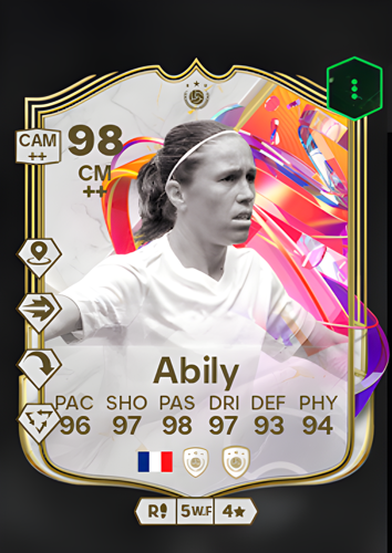 Camille Abily's Icon card stands out as a top-tier Center Midfielder, boasting an impressive overall rating of 98. With exceptional individual attributes—96 pace, 97 shooting, 98 passing, 97 dribbling, 93 defense, and 94 physicality—this card offers a rare blend of technical brilliance and athletic prowess. In the heart of the midfield, Abily’s card provides unparalleled versatility; her outstanding passing and dribbling allow for precise ball distribution and creative playmaking, while her high defensive and physicality ratings ensure she can win back possession and control the tempo of the game. Whether orchestrating attacks or breaking up opposition plays, this card is a game-changer, giving you the edge to dominate the midfield and dictate every match.